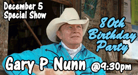 Gary P Nunn's 80th Birthday Party![]() Limited Seating! Get tix here. Your ticket includes special "Meet & Greet" Access>> |